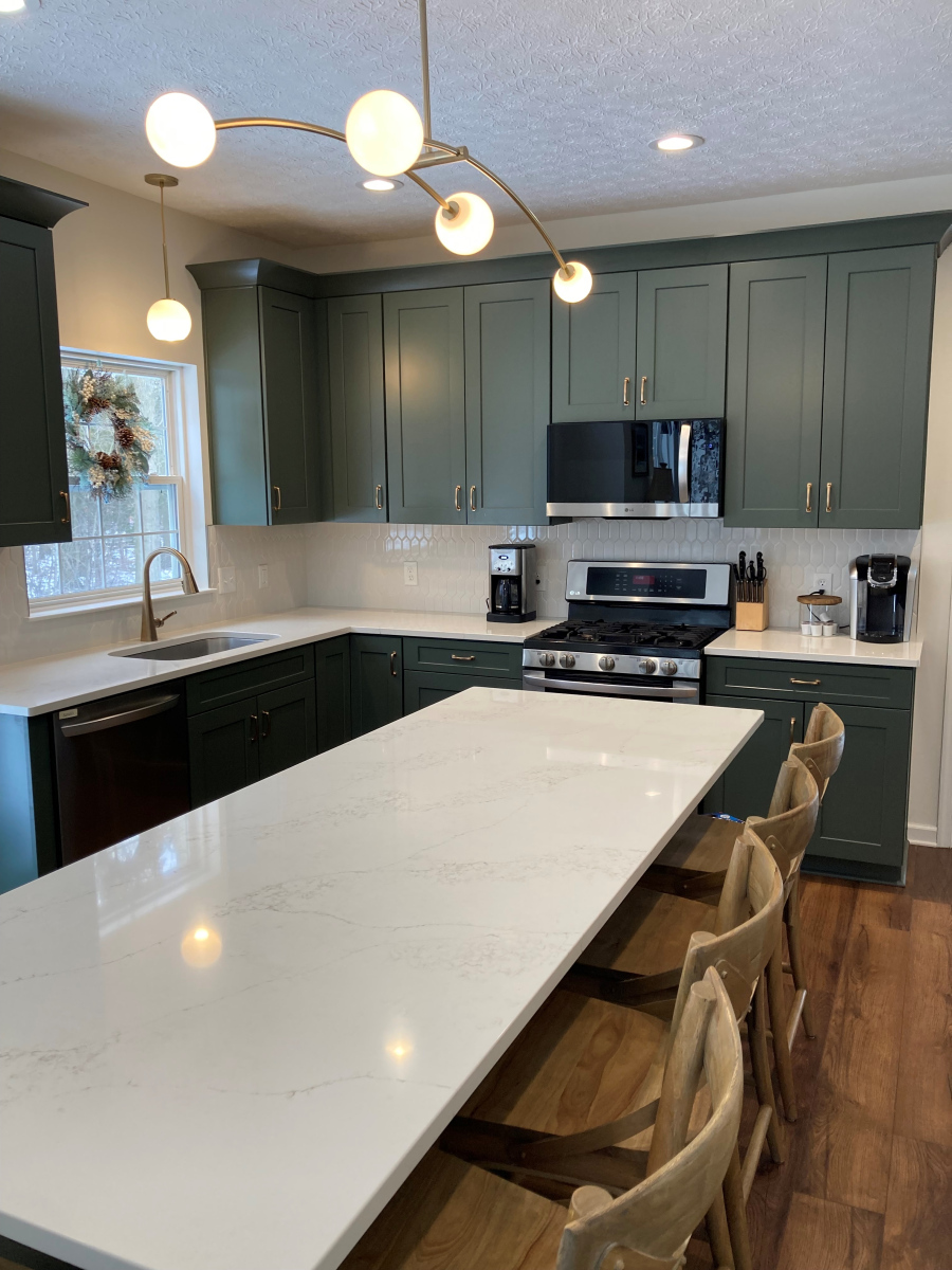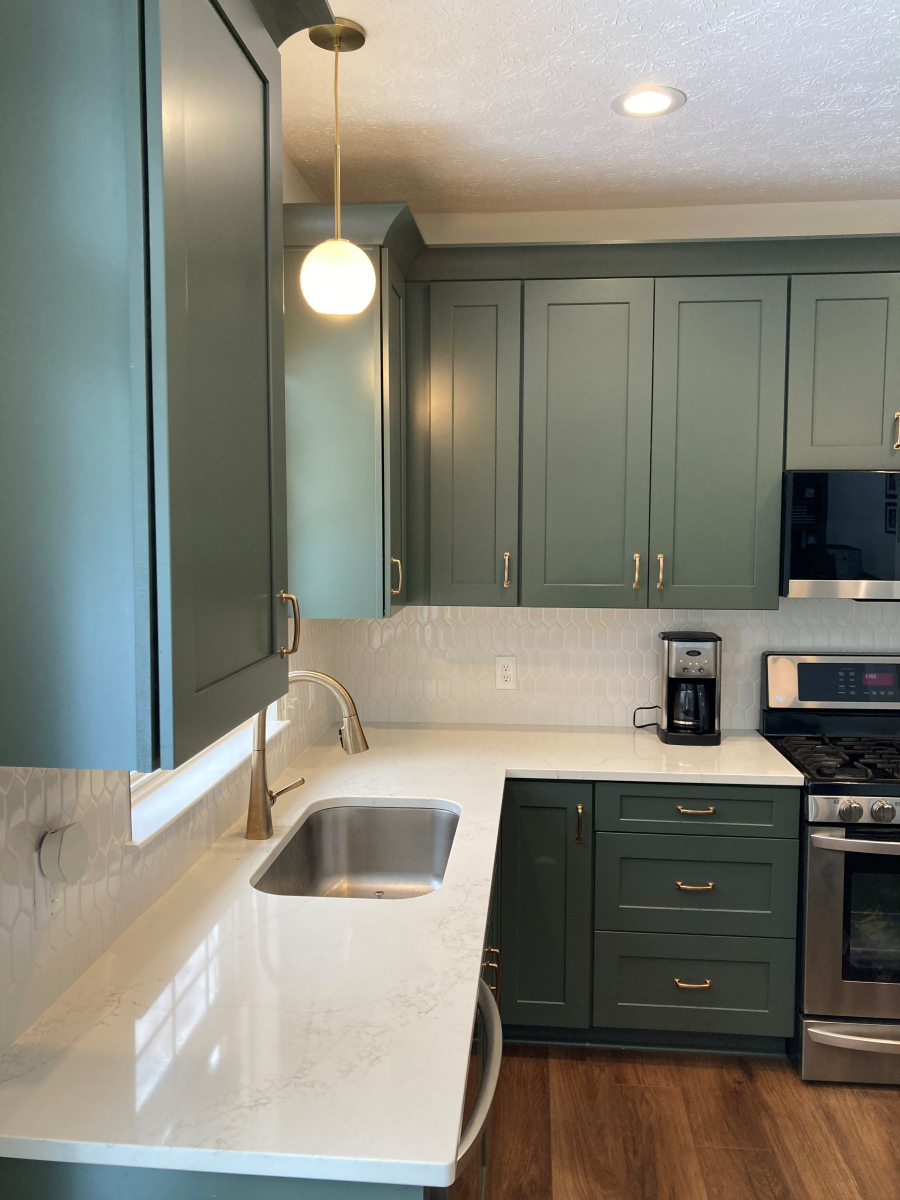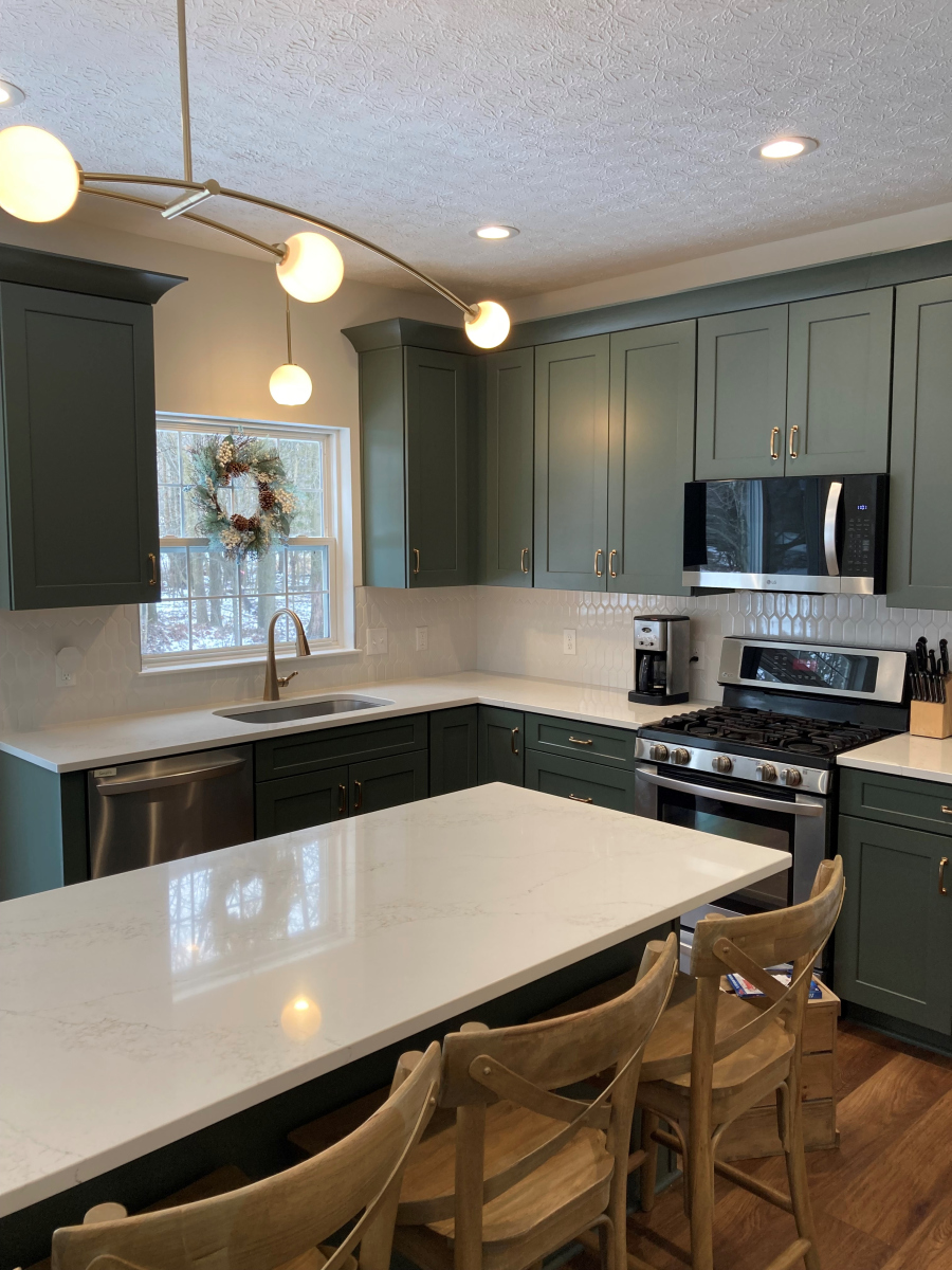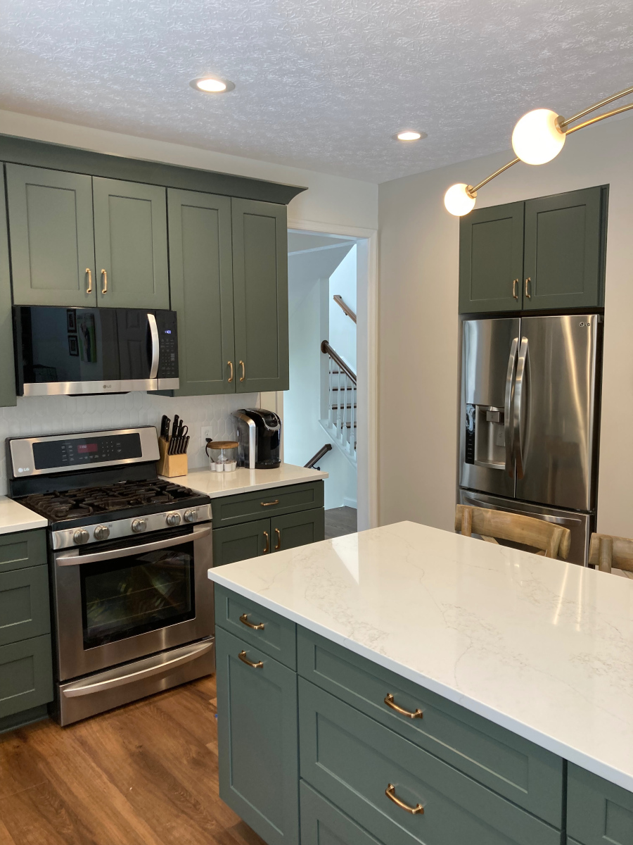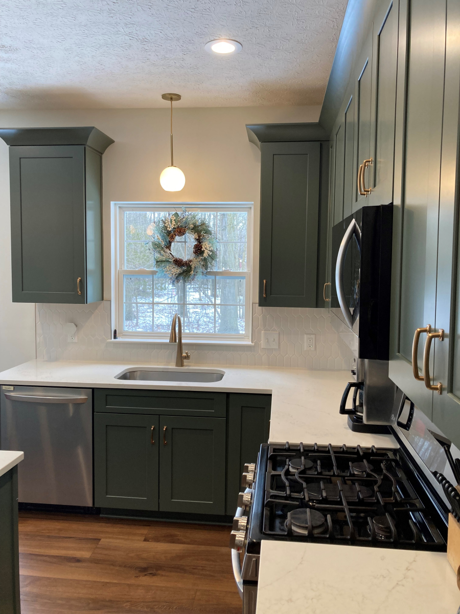 Our team completed a full kitchen transformation for this Avon, Ohio home, focusing on both function and timeless design. The project included the removal of the existing cabinetry and countertops and the installation of new shaker-style painted kitchen cabinets in a sage green finish. This color choice adds warmth and character to the space while maintaining a clean, modern aesthetic.